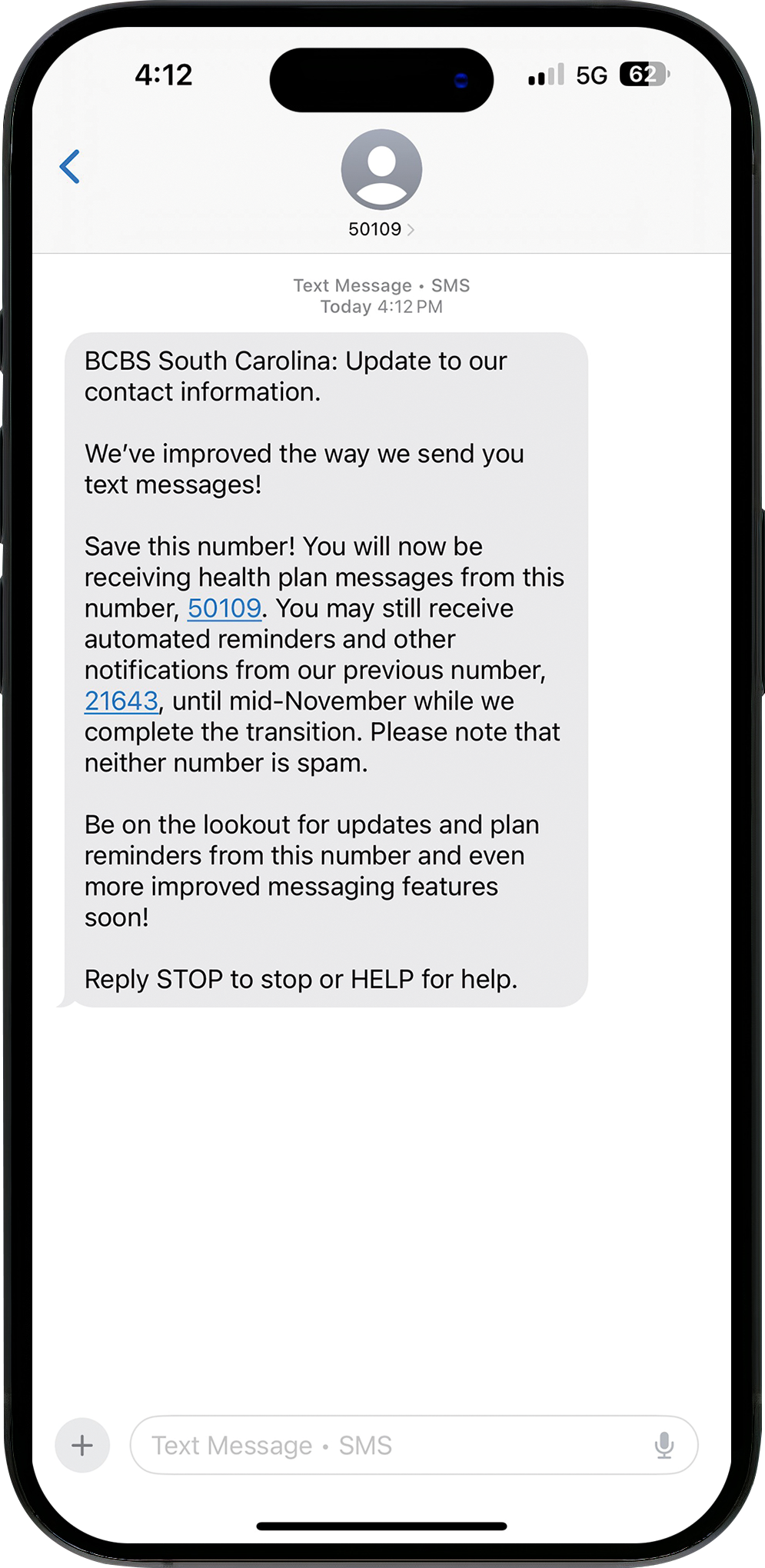 We are excited to inform you that BlueCross BlueShield of South Carolina is transitioning to a new SMS text message platform to improve and enhance our communication with members! With this new platform, members will have faster access to information directly in the SMS, without needing to log in or click a link.